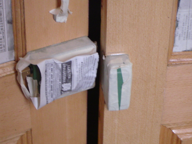 看一下门上被贴住的玻璃。这是原房主留下的磨砂玻璃,被我们割开利用上了。