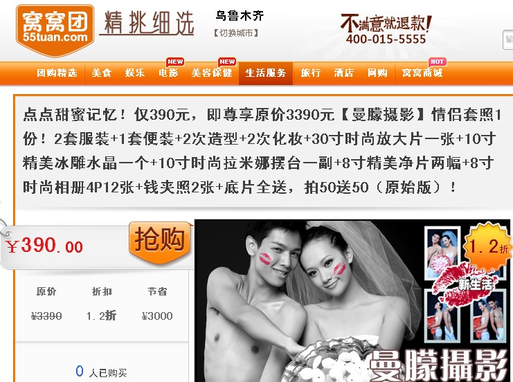 点点甜蜜记忆!仅390元,即尊享原价3390元【曼朦摄影】情侣套照1份!2套服装+1套便装+2次造型+2次化妆+30寸时尚放大片一张+10寸精美冰雕水晶一个+10寸时尚拉米娜摆台一副+8寸精美净片两幅+8寸时尚相册4P12张+钱夹照2张+底片全送,拍50送50(原始版)!