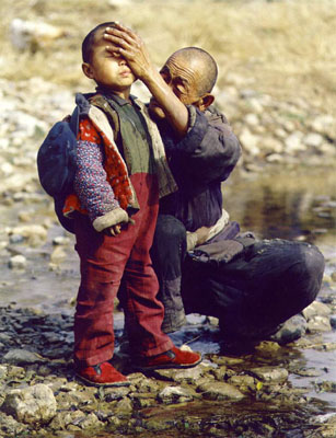 这就是生活在贫困山区的父子,他们一生别无所求。只求有一块属于自己的土地。也许一辈子他们都不知道外面的世界是什么样子。他们没上过楼梯,没打过“的士”,没进过电影院,可就是朴实勤劳的人们一代代的供养着我们。皇天厚土无以回报。爱他们吧,至少在感情上尊重他们。否则我们还谈什么人性?